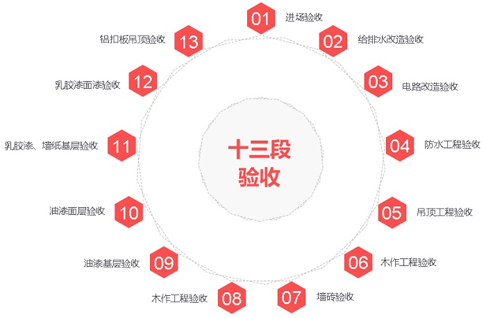 為確實(shí)保護(hù)客戶的切身利益,保證工程高品質(zhì)的質(zhì)量,蘇技創(chuàng)意裝飾采取“十三段驗(yàn)收”,內(nèi)容包括: