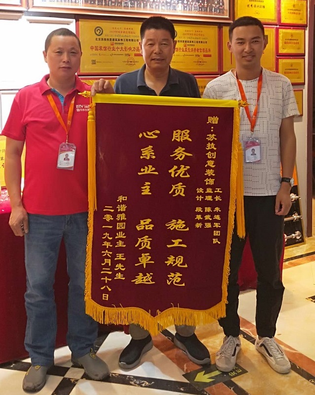 和諧雅園業(yè)主送來(lái)錦旗,表?yè)P(yáng)蘇技裝修團(tuán)隊(duì)。
