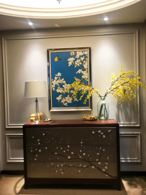 玄關一進門就能看到用壁畫裝飾的玄關,四面的墻壁選用的色調是高級灰,更能凸顯業(yè)主的性格。繁復的雕刻卻又不失工業(yè)的風格,但是同時也不失舊又有浪漫的感覺。